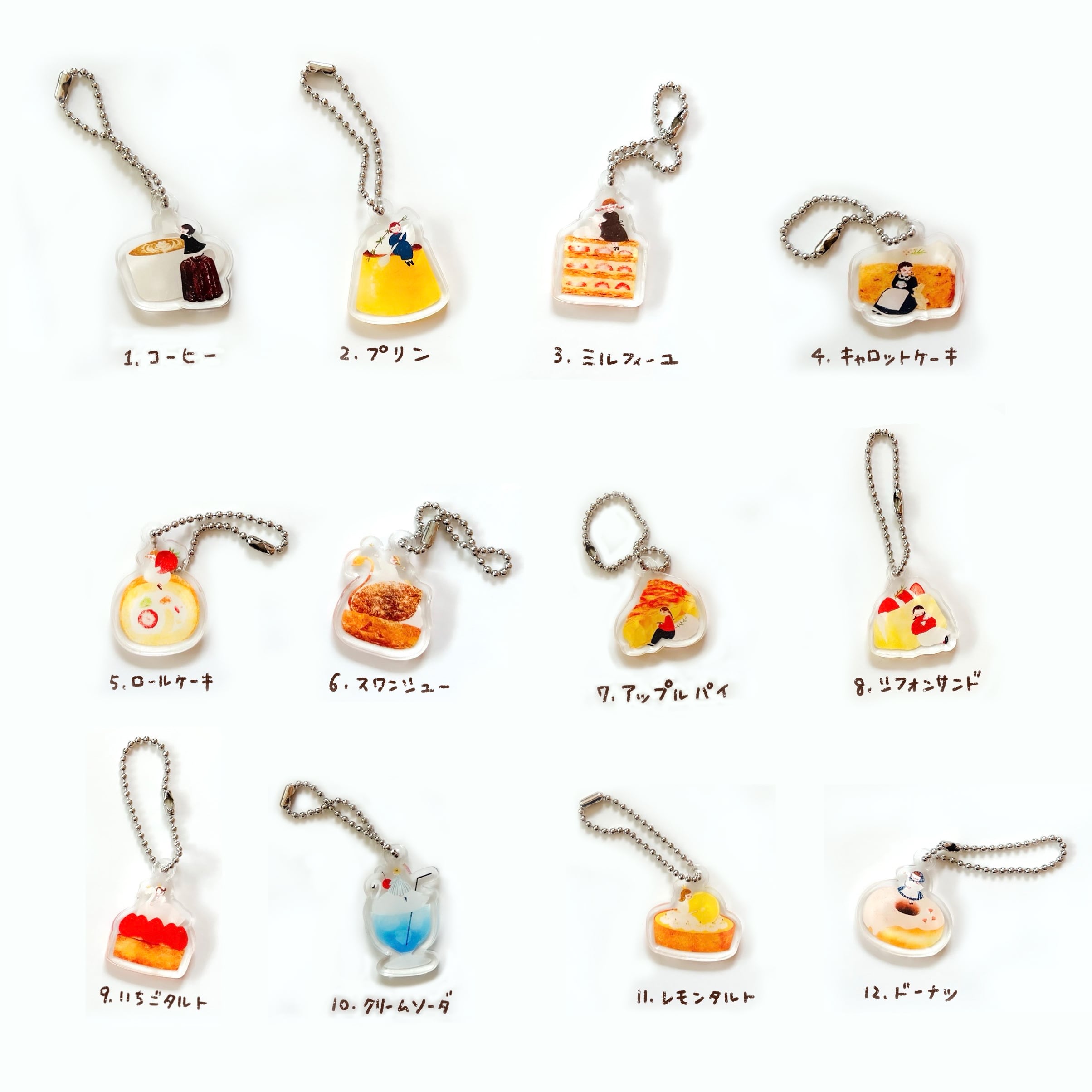鍵やカバンのチャームなどにつけられるミニキーホルダーです ※ こちらの商品はアクリル板両面に保護シートが貼ってあります はがしてからお使いください 素材:アクリル サイズ:最大横3cm 最大縦3.5cm